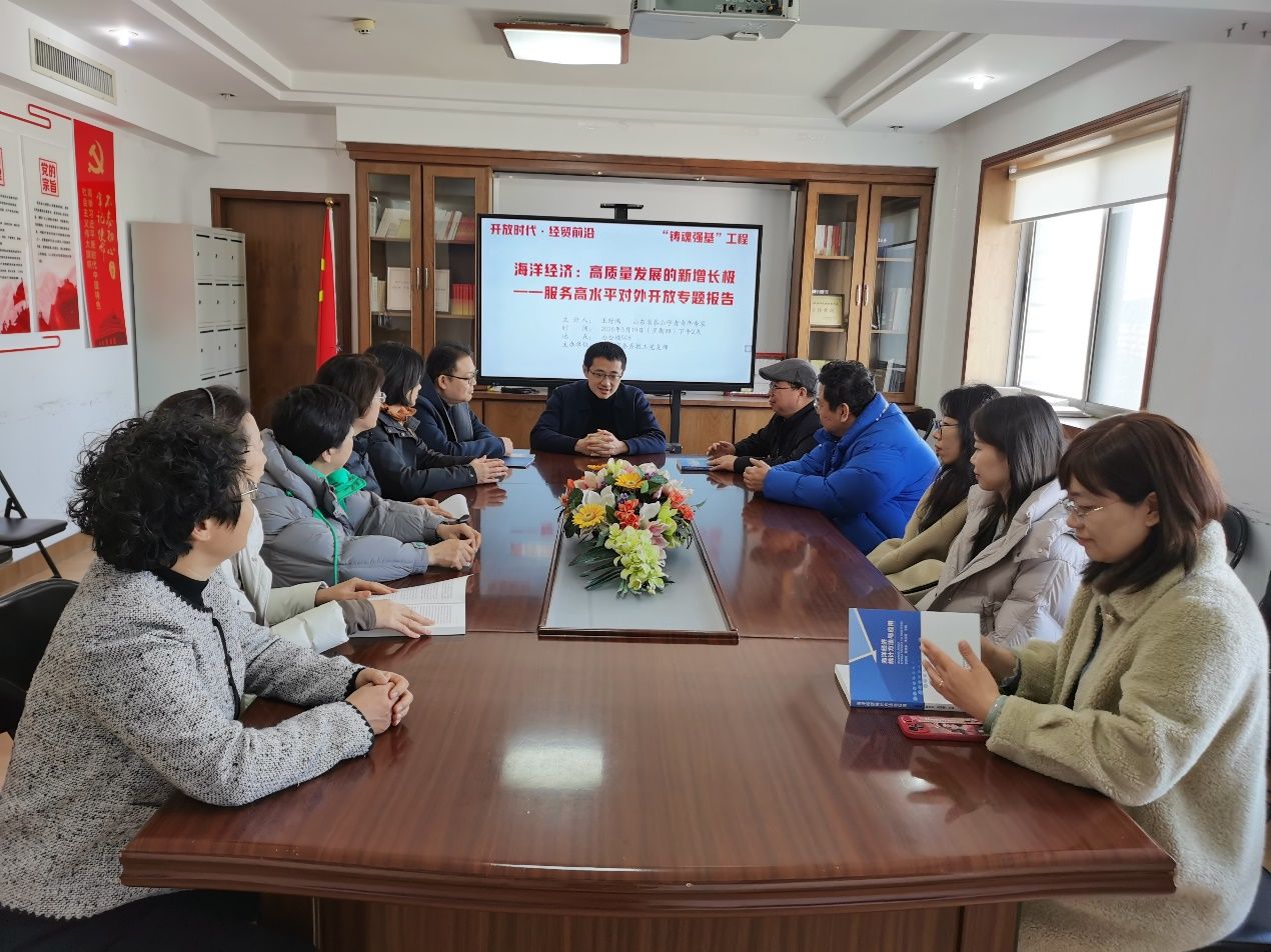 为学习贯彻二十届四中全会和习近平总书记在《求是》杂志发表的重要文章《推动海洋经济高质量发展》精神,3月19日下午,国际商务系教工党支部举办了“铸魂强基”党建品牌活动——“开放时代·经贸前沿”讲座。本次讲座特邀山东省泰山学者青年专家、长期致力于海洋经济研究的学者、王舒鸿教授作“海洋经济:高质量发展的新增长极”专题讲座。党支部书记张照玉主持,国际商务系教工党支部全体党员聆听讲座。
