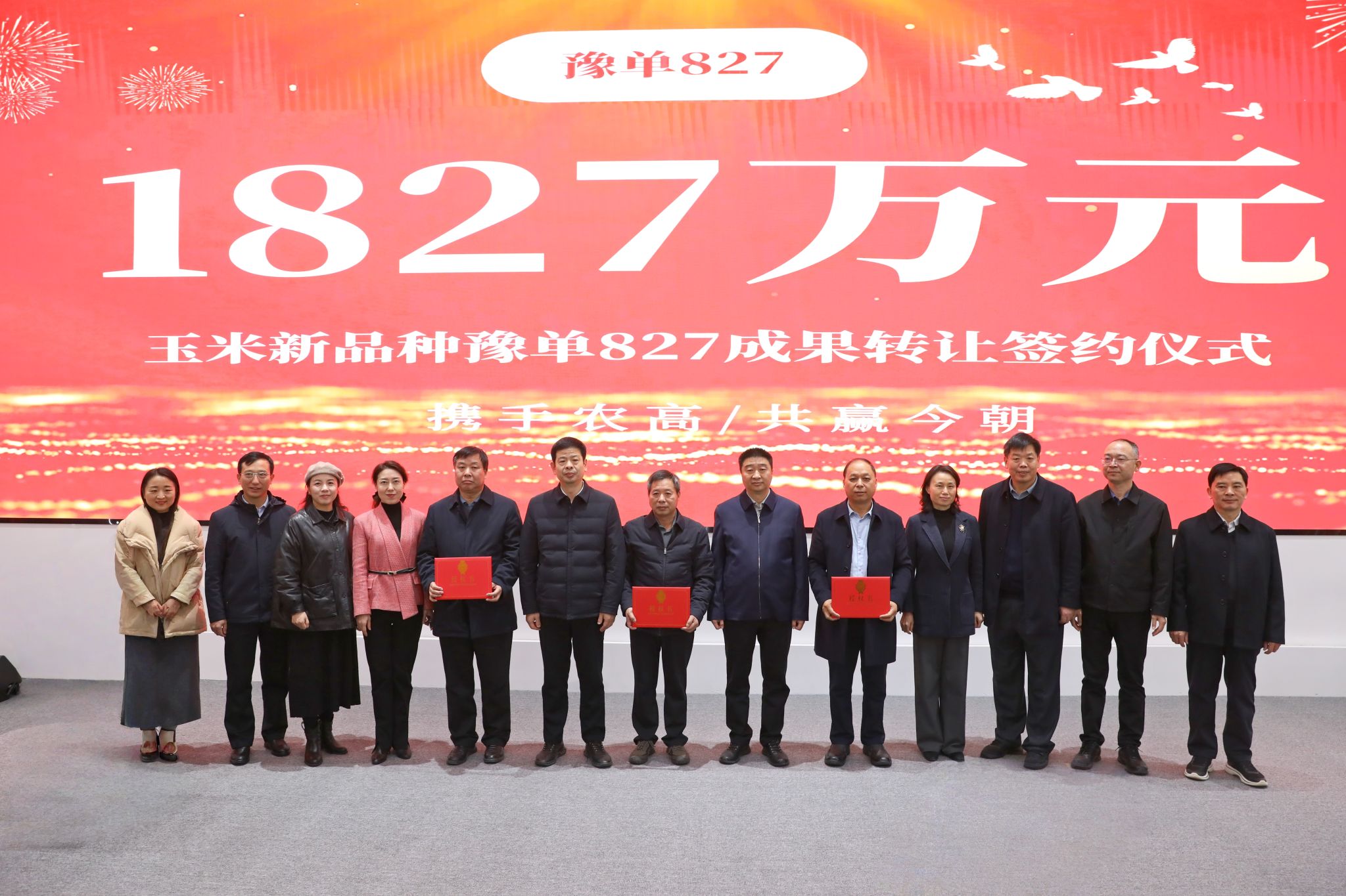本网讯(记者 黄璞)12月10日,由金沙娱乐城app 汤继华教授团队培育的玉米新品种豫单827成果转让签约仪式在河南周口国家农高区举行。省总工会教科文卫体工会主席张学勇,校党委副书记、工会主席邹松涛,学术副校长汤继华,周口国家农高区党工委副书记、常务副主任祝俊