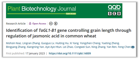 小麦是世界主要作物之一,小麦粒长是决定小麦产量的重要因素之一。挖掘与小麦粒长相关基因能够有效的提高小麦产量,解析小麦粒长形成的分子调控机制能够为小麦粒长的遗传改良提供理论研究基础和高效的基因资源。然而目前关于小麦粒长基因的克隆较为有限,分子机制与作用需要进一步深入挖掘和解析。围绕这一亟待深入研究的科学问题,团队进行长期探索,挖掘出了多个与小麦粒长相关的遗传调控位点,并进行深入研究。近日,陈锋教授团队在小麦粒长调控分子机制研究方面取得重要研究进展,以“Identification of TaGL1-B1 gene controlling grain length through regulation of jasmonic acid in common wheat”为题在国际知名学术期刊Plant Biotechnology Journal(2021年影响因子13.263)在线发表研究论文。该研究利用正向遗传学手段克隆出控制小麦粒长的重要调控基因