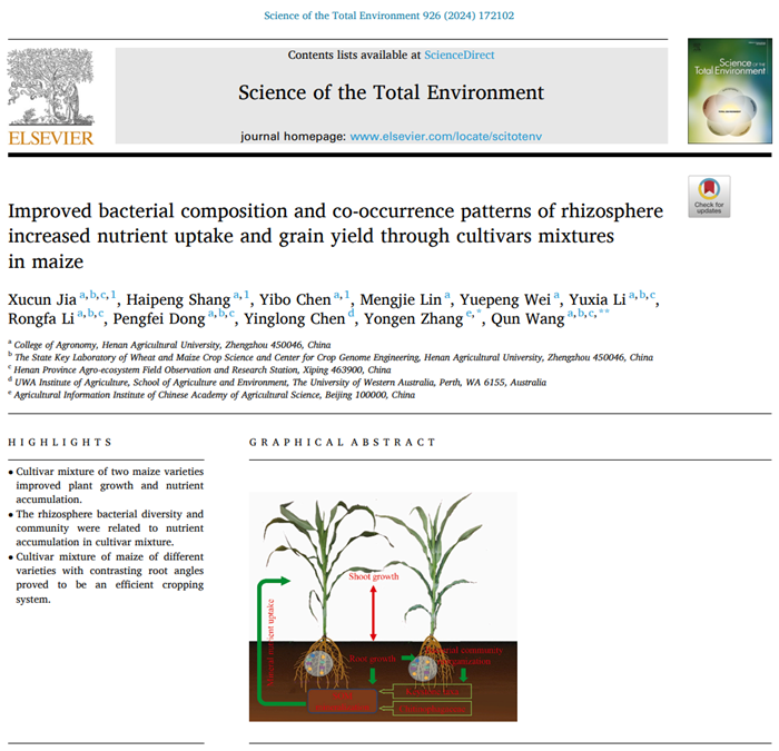 河南农业大学玉米高产栽培与逆境生理创新团队硕士研究生尚海鹏为论文共同第一作者,青年教师贾绪存为论文第一作者,王群教授为论文通讯作者。该研究得到国家现代农业产业技术体系项目、河南省自然科学基金等项目的资助支持。
