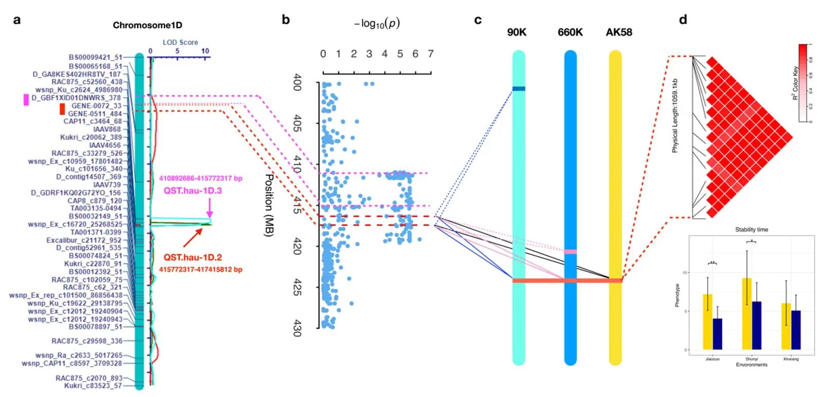 该研究基于矮抗58高质量参考基因组,融合更新了小麦660K与90K SNP芯片标记并将其应用于面团流变学特性研究,通过全基因组关联分析(GWAS)、QTL定位、共线性分析、基因表达量分析等手段,定位到多个调控小麦流变学特性的重要遗传区段,并预测了控制面团稳定时间的7个候选基因,找出了优异单倍型,为小麦品质性状改良提供了重要基因资源。