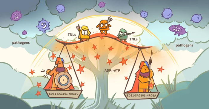 TNL类抗病蛋白,在感知到病原微生物之后形成四聚化的“抗病小体”。这些抗病小体就像古时候负责点燃烽火台的卫兵,一系列