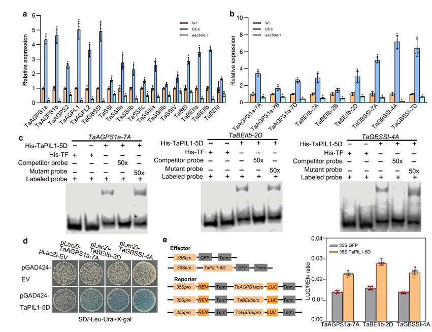 腺苷葡萄糖焦磷酸化酶(AGPase)是控制作物淀粉合成的关键酶,该团队发现bHLH转录因子家族一个成员—TaPIL1能与淀粉合成酶胞质型小亚基基因(TaAGPS1a)启动子结合,该基因的基因编辑和过量表达两类转基因材料的籽粒淀粉含量、粒重及产量发生了显著变化,表明TaPIL1能正向调控小麦籽粒淀粉的合成,进而提高了粒重和籽粒产量(图1)。