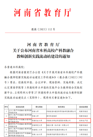 近日,河南省教育厅发布了《关于公布河南省本科高校校产科教融合教师创新实践流动站建设的通知》(教高〔2023〕112 号文),本次全省共立项建设27项流动站,其中农林生产类2项,金沙娱乐城app
