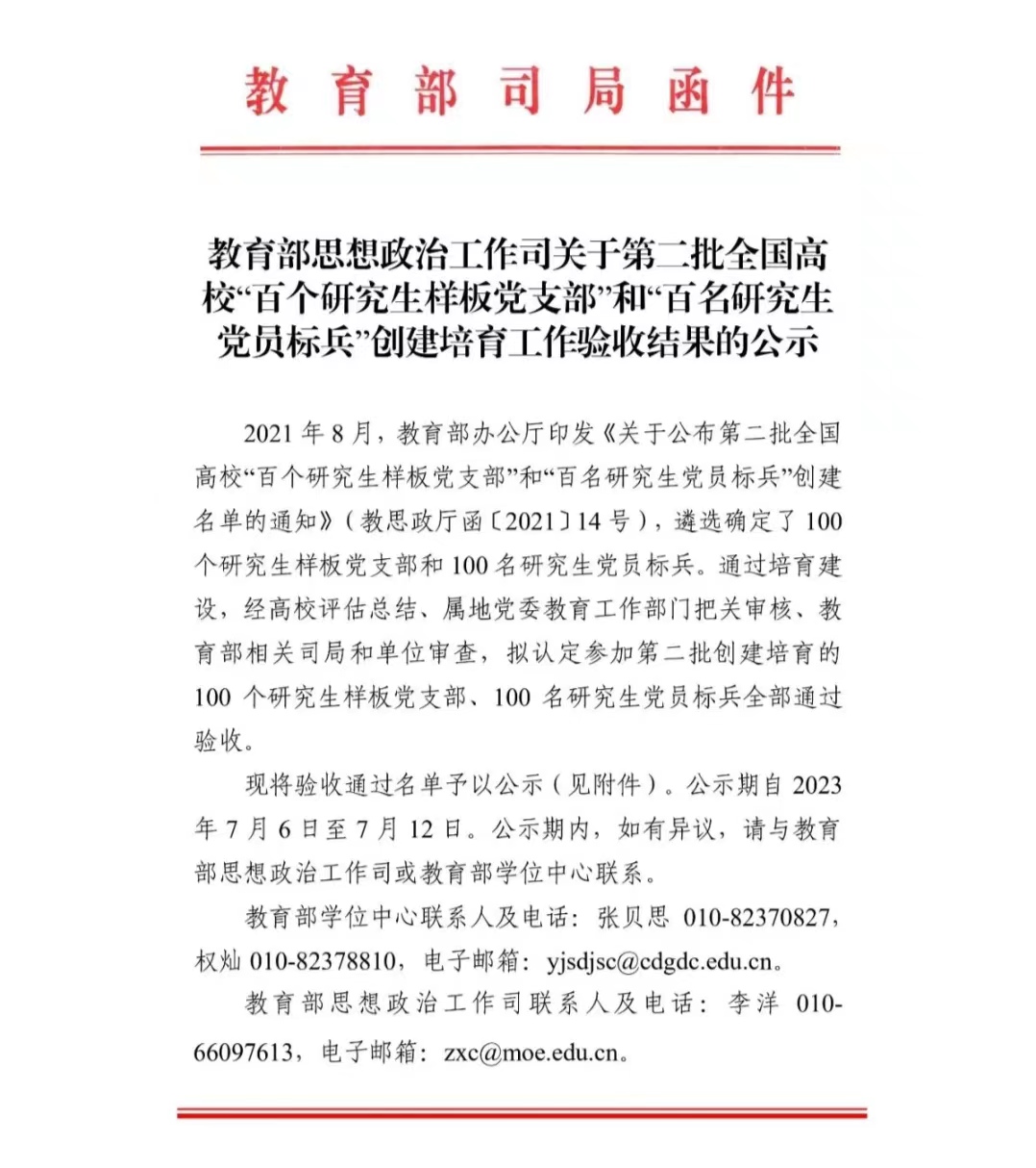 本网讯(通讯员 朱瑞萍 武梦蕊)近日,教育部思想政治工作司、教育部学位与研究生教育发展中心发布《关于第二批全国高校“百个研究生样板党支部”和“百名研究生党员标兵”创建培育工作验收结果的公示》。金沙娱乐城app
