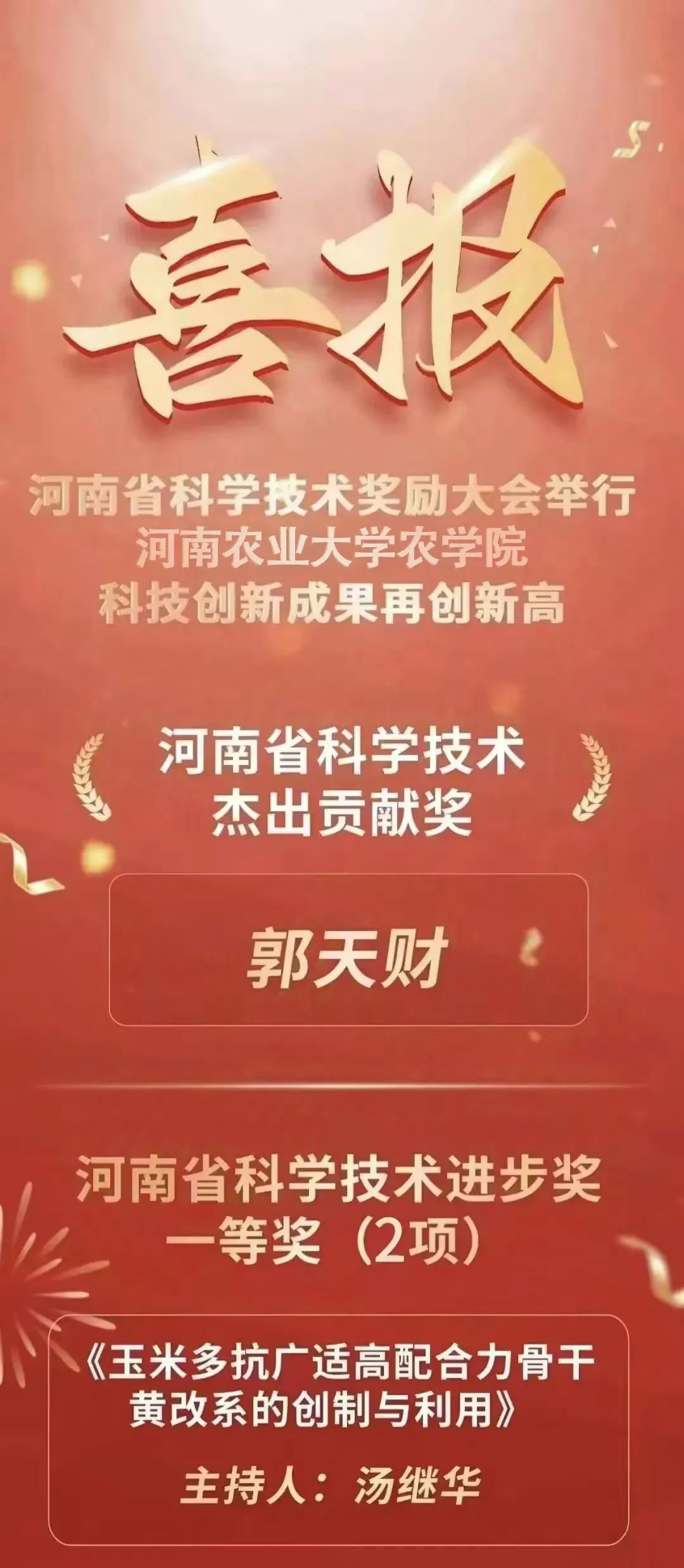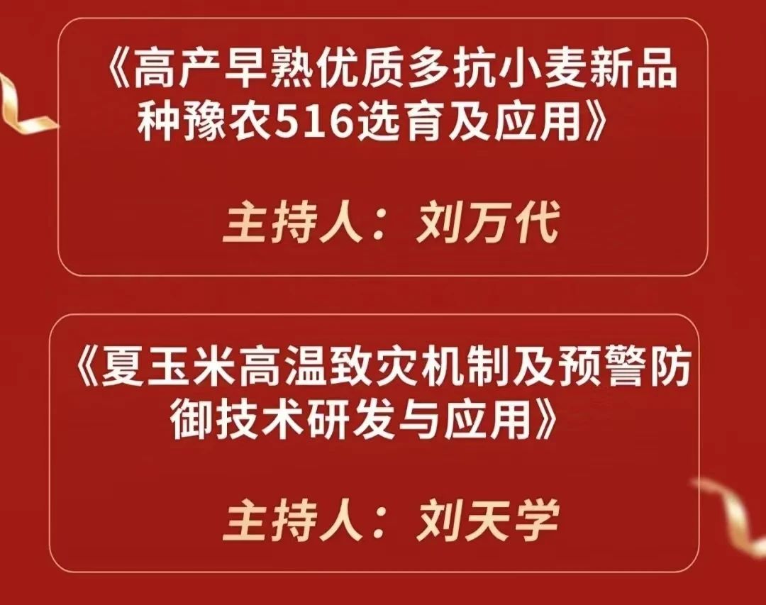 郭天财教授获河南省科学技术杰出贡献奖。汤继华教授团队“玉米多抗广适高配合力骨干黄改系的创制与利用”,殷冬梅教授团队“花生种子发育遗传解析与高产优质新品种培育及应用”获省科学技术进步一等奖。刘万代研究员团队“高产早熟优质多抗小麦新品种豫农516选育及应用”,刘天学教授团队“夏玉米高温致灾机制及预警防御技术研发与应用”,王同朝教授团队“小麦玉米两熟水肥精准轻简增效技术创新与应用”获省科学技术进步二等奖。