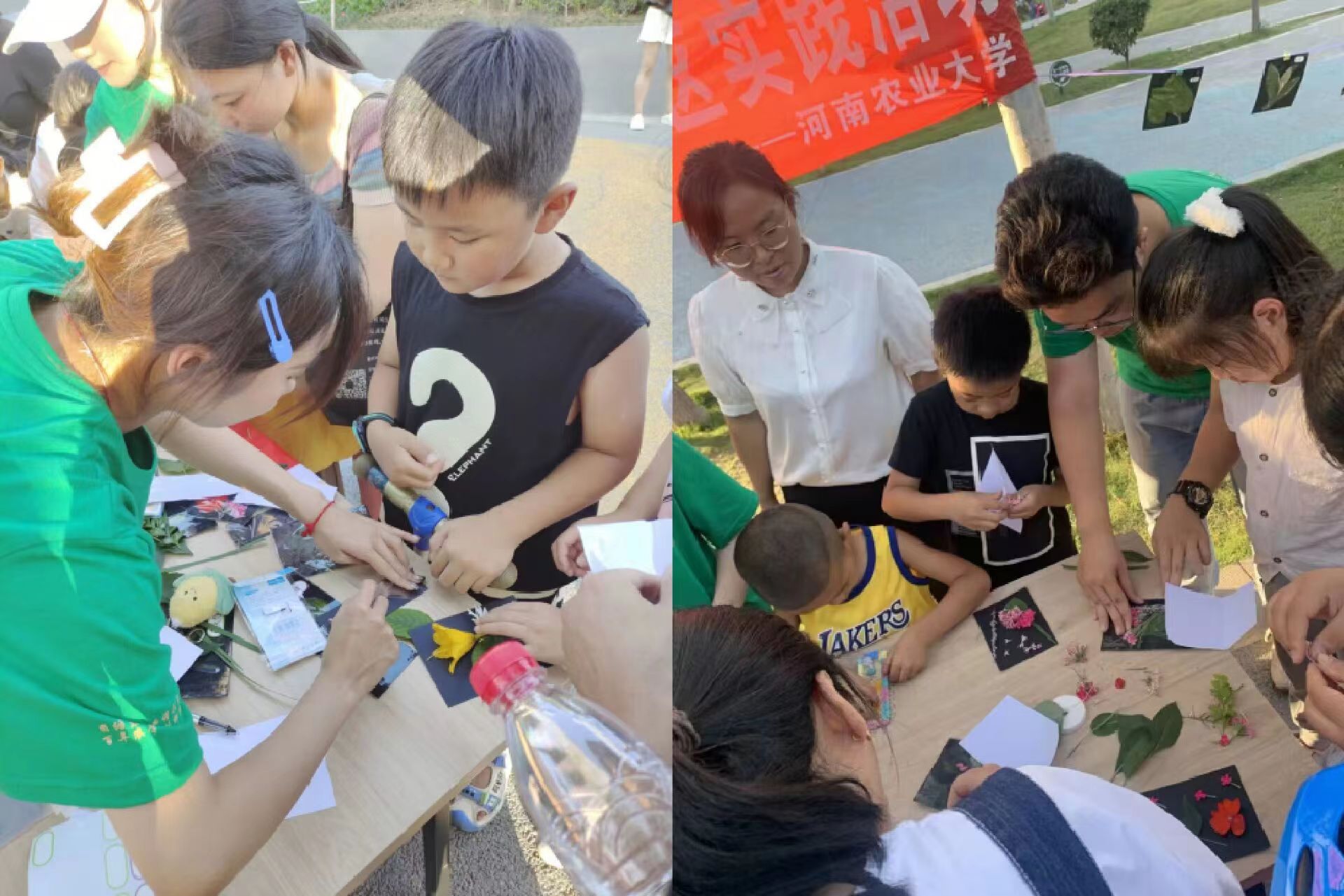 这天下午的温度已然升到39度,志愿者们顶着高温进行场地的布置。即便是炎热的高温也阻挡不住孩子们的好奇,志愿者们更是带着十二分的热情给孩子们讲解农业知识。在活动过程中,志愿者们分工行动,他们耐心地教孩子们如何制作植物标本,这对于孩子们来说无疑是一种寓教于乐的学习农业知识的好方法。孩子们拿着写有自己姓名或植物名称的标本时,脸上的笑容便是这世界上最纯真的产物之一,这便是实践团努力结果的最好体现。